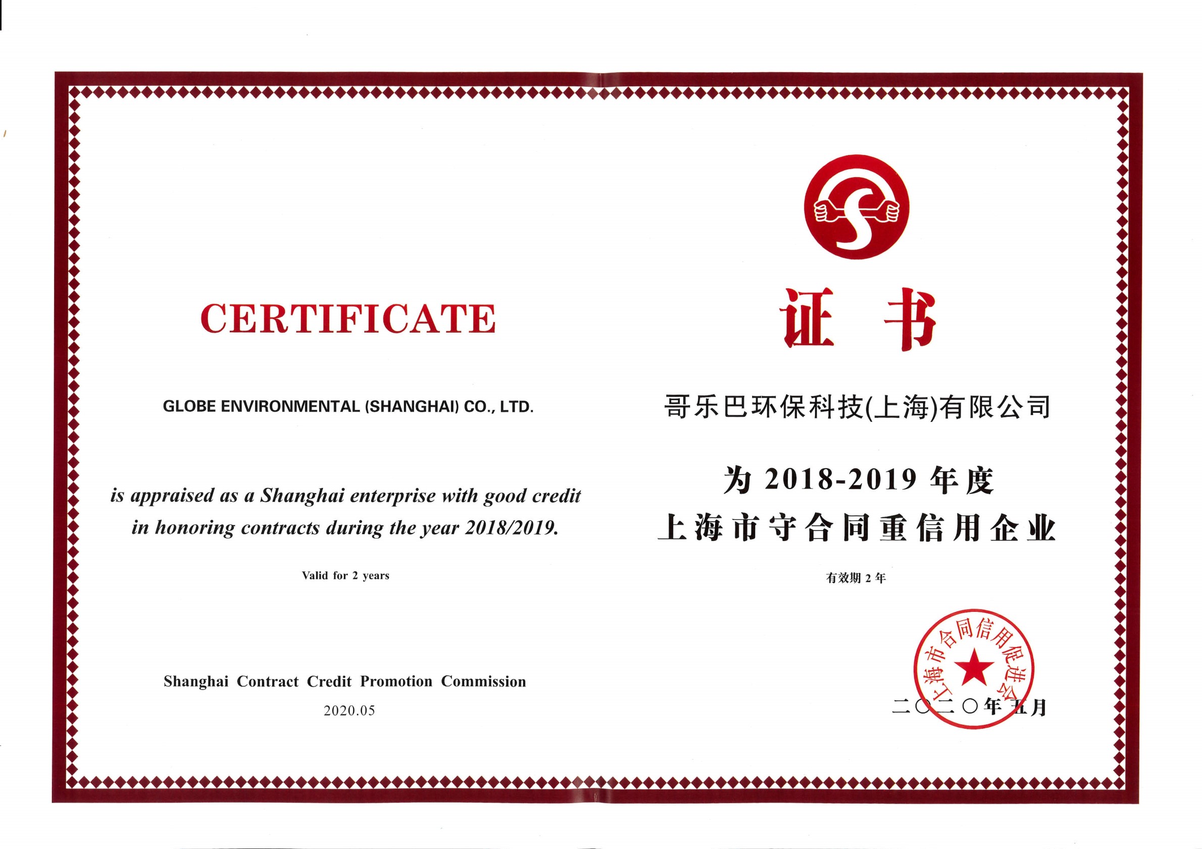 2018-2019年度我司被評(píng)為上海市守合同重信用企業(yè),于2020年5月獲得證書。